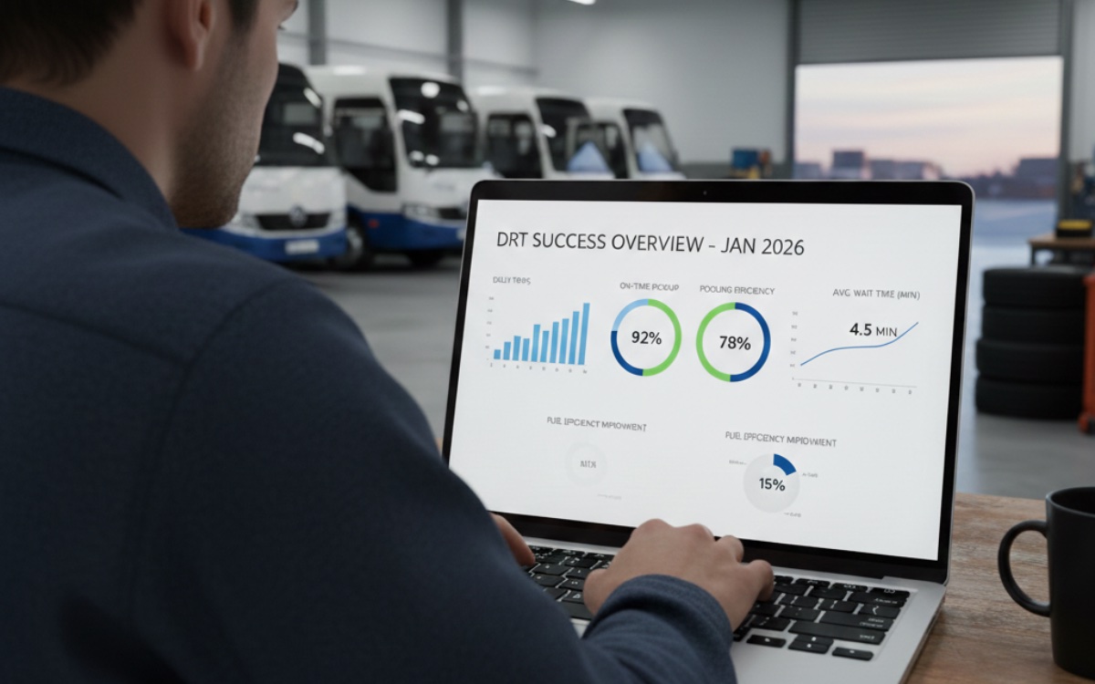 DRT success goes beyond ridership: track wait time, booking success, occupancy, pooling, cancellations, NPS, equity/coverage, cost per trip and on-time performance to steer reliable growth.